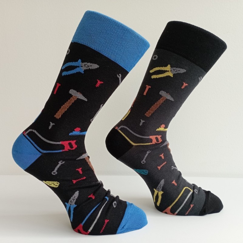 Velikosti 39-50. Pánské „trendy“ ponožky z vysoce kvalitní česané bavlněné příze. S motivem nářadí. Vhodné pro každodenní nošení.