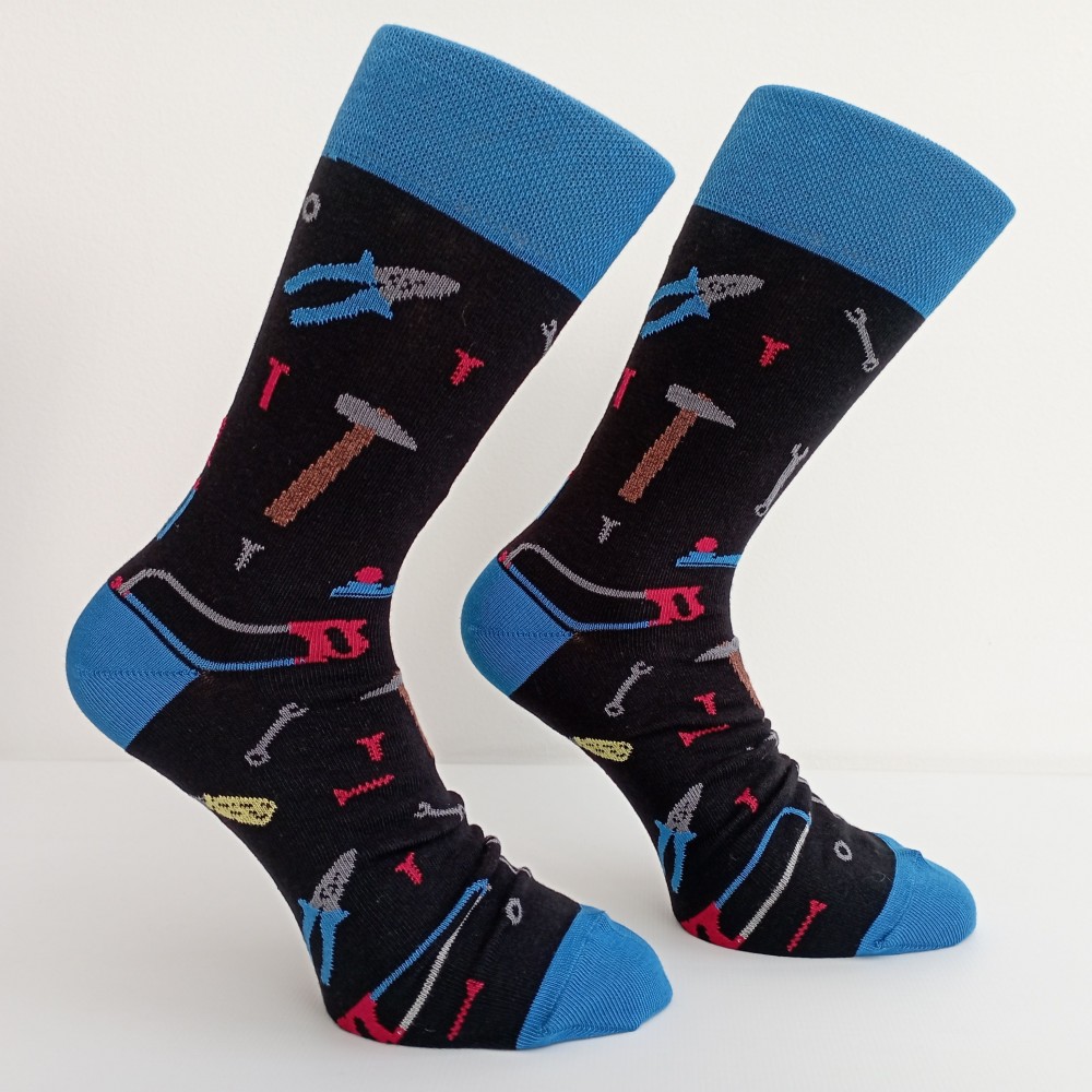 Velikosti 39-50. Pánské „trendy“ ponožky z vysoce kvalitní česané bavlněné příze. S motivem nářadí. Vhodné pro každodenní nošení.