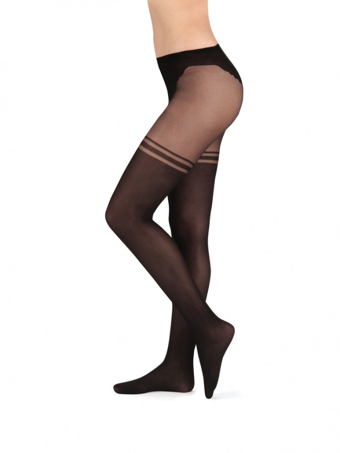 Punčochové kalhoty s imitací nadkolenek a s pruhy, které zvýrazní krásu Vašich nohou. Punčochy bez klínku a zesílené špičky, s plavečkovým sedem.